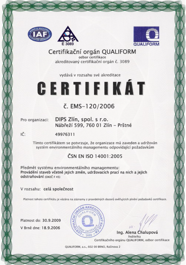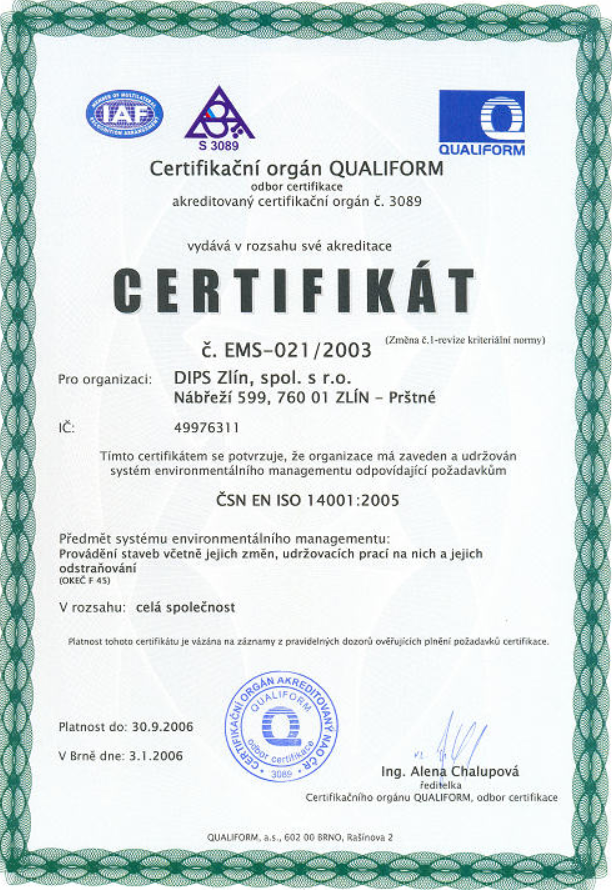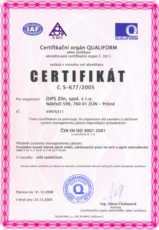 Společnost DIPS Zlín, spol.s r.o. má zaveden a certifikován systém managementu jakosti dle ČSN EN ISO 9001:2001.